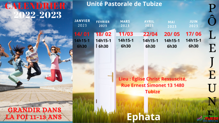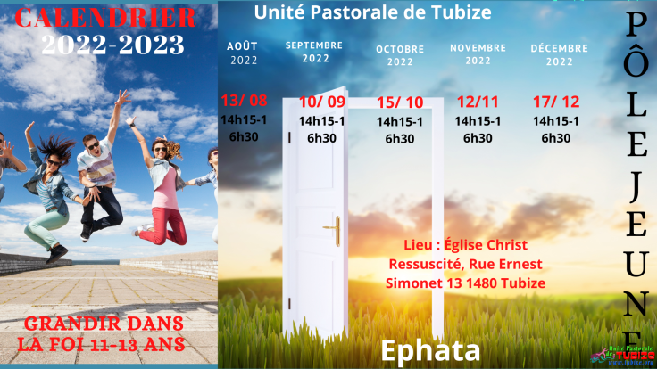 Voici le calendrier 2022-2023 pour le groupe grandir dans la foi. Ce groupe réunit des jeunes entre 11-13 ans qui se rencontrent un samedi par mois pour faire des activités ludiques et spirituelles. l’objectif est de donner un espace ou les jeunes partages, discuter, créer des lien de fraternité. Ils approfondissent leurs connaissance de Jésus Christ, de sa parole, de l’Église.