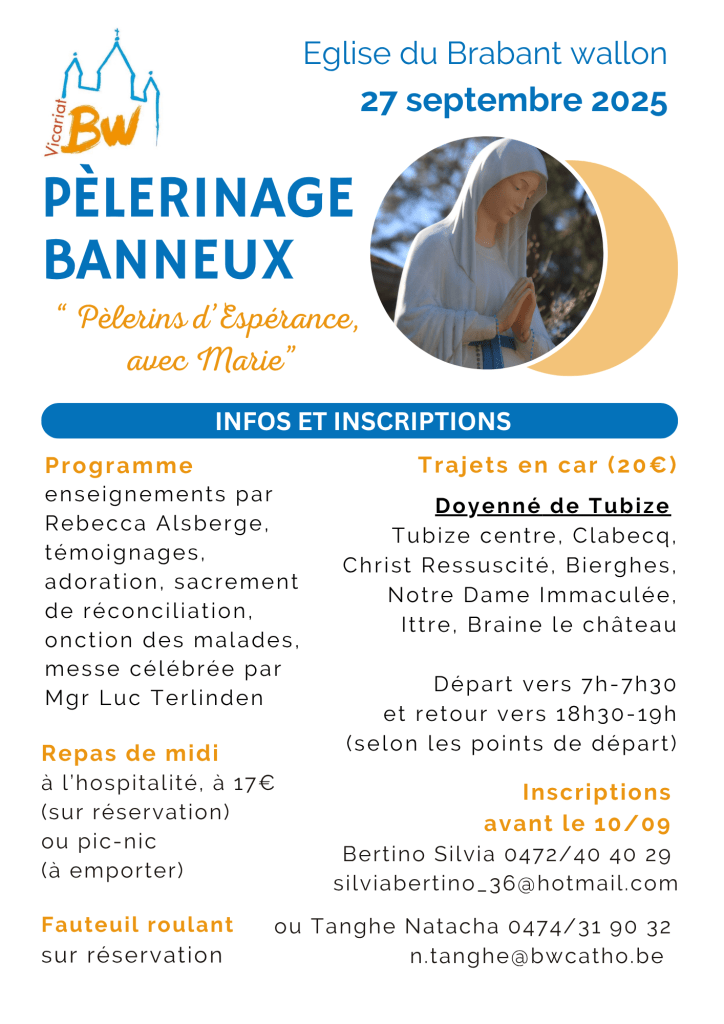 C’est durant la journée du 27 septembre 2027 que le doyenné de Tubize se rassemblera à Banneux avec tous les unités pastorales du BW pour vivre une belle rencontre sur le thème « Pèlerins de l’Espérance avec Marie »