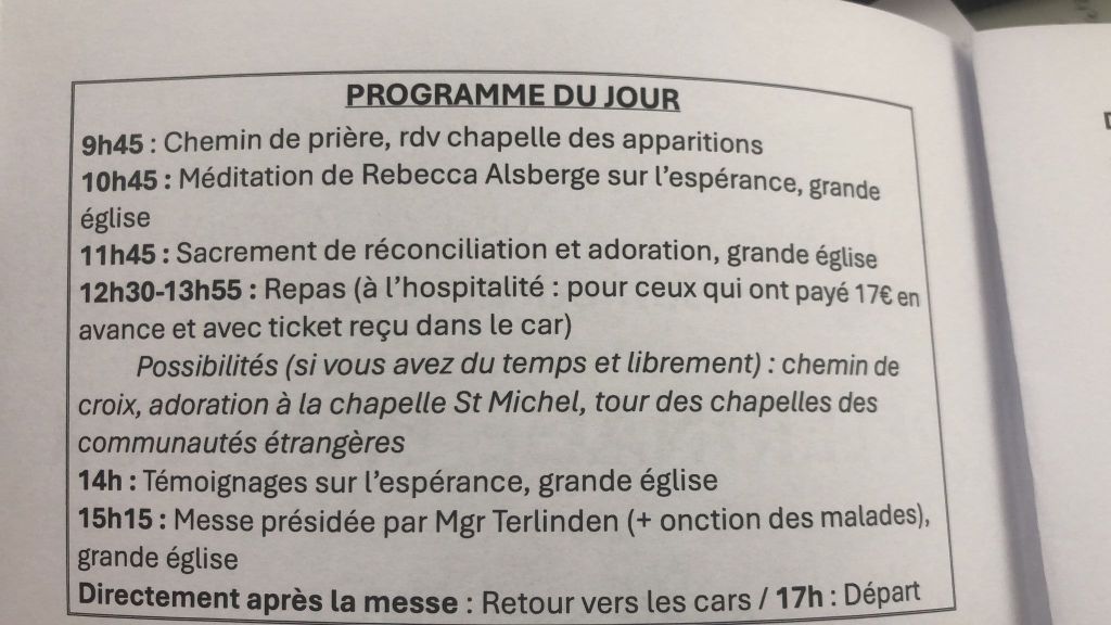 Les formulaires doivent être envoyés ou remis aux responsables dans les paroisses pour le 26 Septembre 2024 ( Si vous vous inscrivez entre le 20-26 septembre vous devez contacter Bertino Silvia : 0472/ 40 49 29 – silviabertino_36@hotmail.com pour voir s’il reste encore des places dans le car)