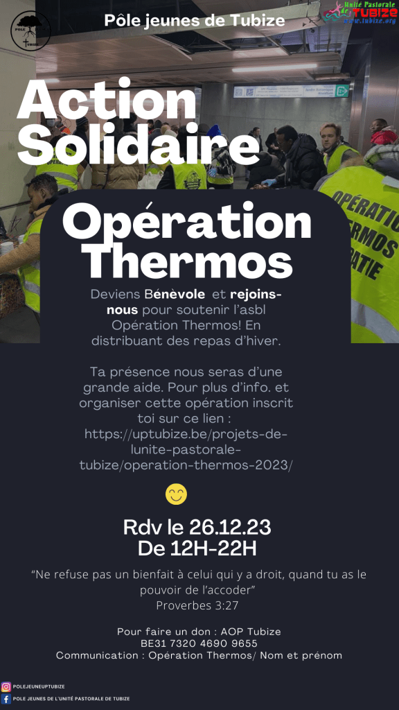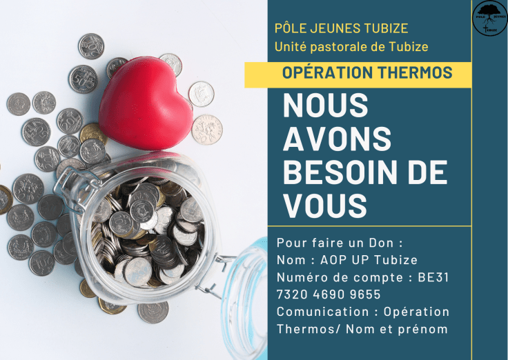 - l’Opération Thermos se réalise dans le cadre du “pôle jeunes de Tubize branche pastorale des vacances” notre objectif principal est de nous rapprocher, d’être à l’écoute et d’offrir notre disponibilité aux personnes dans le besoin durant ce temps de Noël.